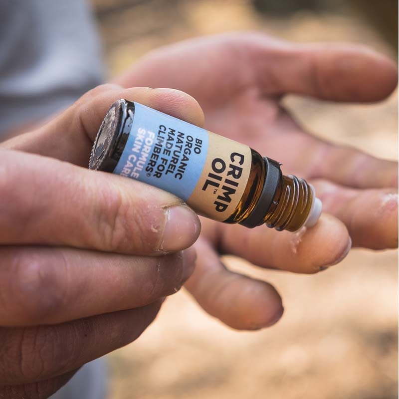 Crimp Oil Skin Care is a dry oil, meaning you can put it before climbing, it doesn’t leave any grease on your skin. Plus the roll-on makes it easier to apply it.