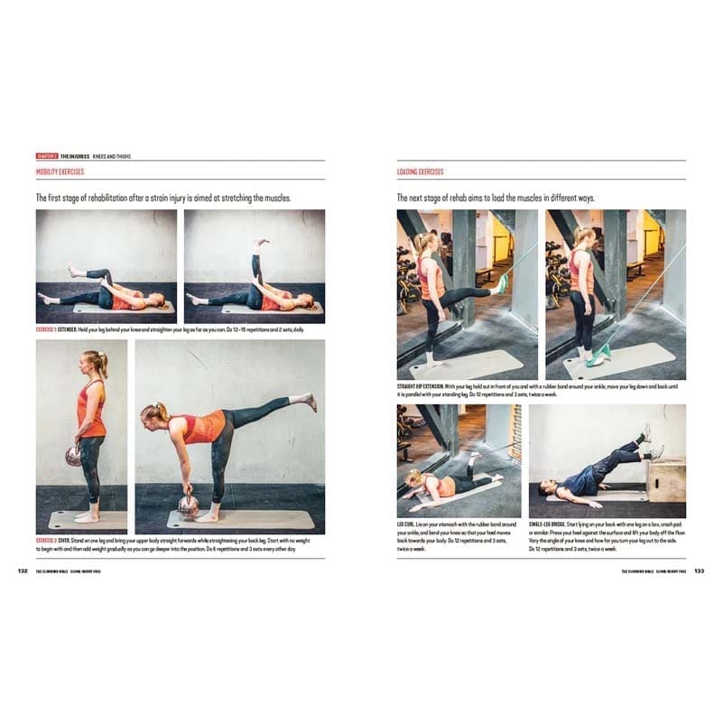 The book divides into three sections and includes anatomical illustrations, along with exercise and action photos. The first section provides an essential overview of factors that affect injuries and rehab, such as sleep, training load, warm-ups, age and gender differences, and strength training.